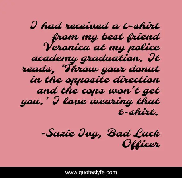 This page presents the quote "I had received a t-shirt from my best friend Veronica at my police academy graduation. It reads, ‘Throw your donut in the opposite direction and the cops won’t get you.’ I love wearing that t-shirt.". Author of this quote is Suzie Ivy, Bad Luck Officer. This quote is about humor, memoir, crime,.