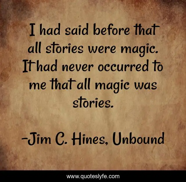 This page presents the quote "I had said before that all stories were magic. It had never occurred to me that all magic was stories.". Author of this quote is Jim C. Hines, Unbound. This quote is about magic, stories,.