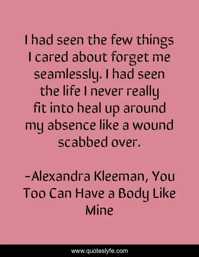 This page presents the quote "I had seen the few things I cared about forget me seamlessly. I had seen the life I never really fit into heal up around my absence like a wound scabbed over.". Author of this quote is Alexandra Kleeman, You Too Can Have a Body Like Mine. This quote is about absence, sad, alexandra-kleeman, forgotten,.