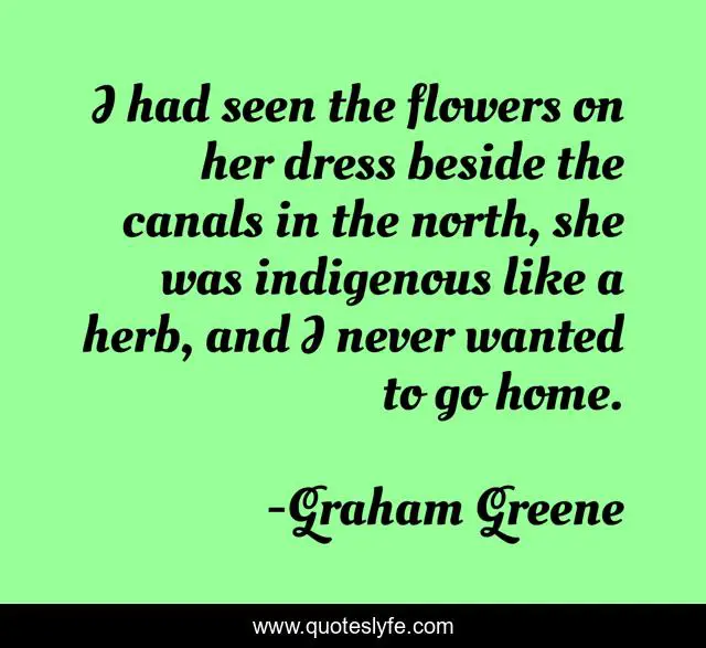 This page presents the quote "I had seen the flowers on her dress beside the canals in the north, she was indigenous like a herb, and I never wanted to go home.". Author of this quote is Graham Greene. This quote is about lust, infatuation,.