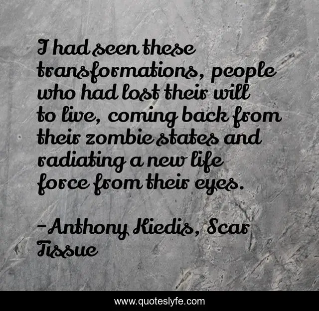 This page presents the quote "I had seen these transformations, people who had lost their will to live, coming back from their zombie states and radiating a new life force from their eyes.". Author of this quote is Anthony Kiedis, Scar Tissue. This quote is about transformation, will-to-live,.