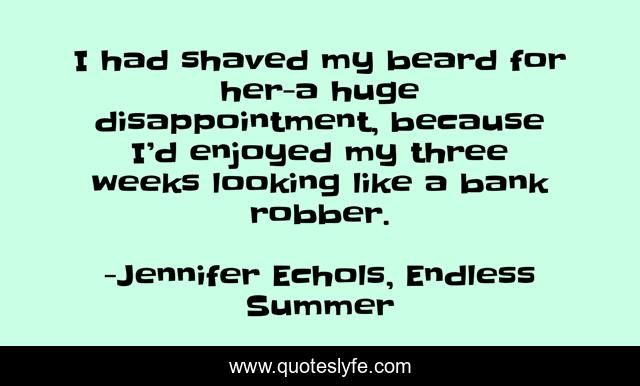 This page presents the quote "I had shaved my beard for her-a huge disappointment, because I’d enjoyed my three weeks looking like a bank robber.". Author of this quote is Jennifer Echols, Endless Summer. This quote is about funny, humour, young-adult-romance, romance, young-adult-fiction, comedy,.