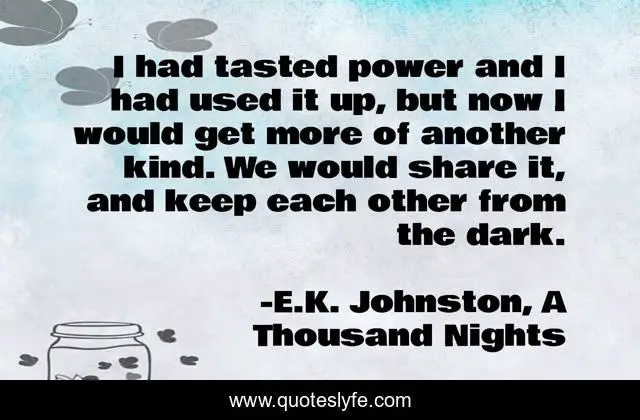 This page presents the quote "I had tasted power and I had used it up, but now I would get more of another kind. We would share it, and keep each other from the dark.". Author of this quote is E.K. Johnston, A Thousand Nights. This quote is about love, power, affection,.
