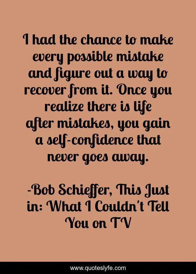 This page presents the quote "I had the chance to make every possible mistake and figure out a way to recover from it. Once you realize there is life after mistakes, you gain a self-confidence that never goes away.". Author of this quote is Bob Schieffer, This Just in: What I Couldn't Tell You on TV. This quote is about anxiety, mistakes, self-confidence, humility,.