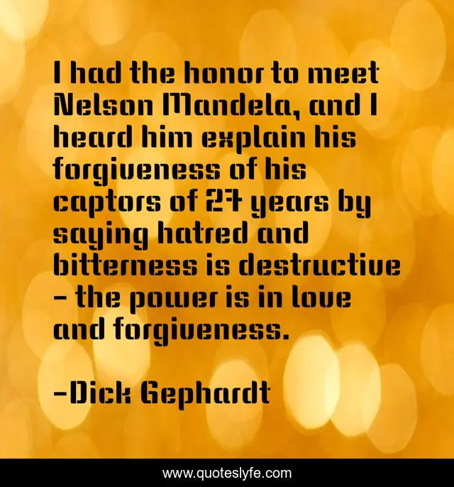 This page presents the quote "I had the honor to meet Nelson Mandela, and I heard him explain his forgiveness of his captors of 27 years by saying hatred and bitterness is destructive - the power is in love and forgiveness.". Author of this quote is Dick Gephardt. This quote is about power, love, honor, affection,.
