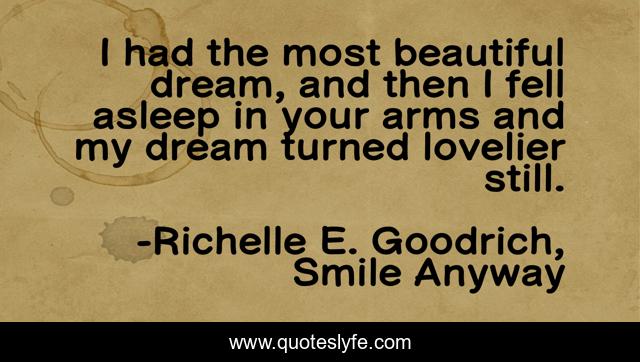 This page presents the quote "I had the most beautiful dream, and then I fell asleep in your arms and my dream turned lovelier still.". Author of this quote is Richelle E. Goodrich, Smile Anyway. This quote is about enchantment, crush, richelle, love-story, richelle-goodrich, dream, affection,.
