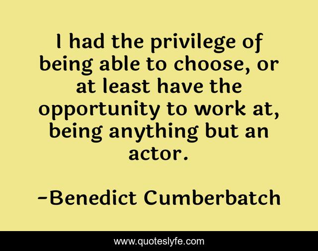 This page presents the quote "I had the privilege of being able to choose, or at least have the opportunity to work at, being anything but an actor.". Author of this quote is Benedict Cumberbatch. This quote is about work, actor, acting, choose, ambition, privilege, opportunity,.