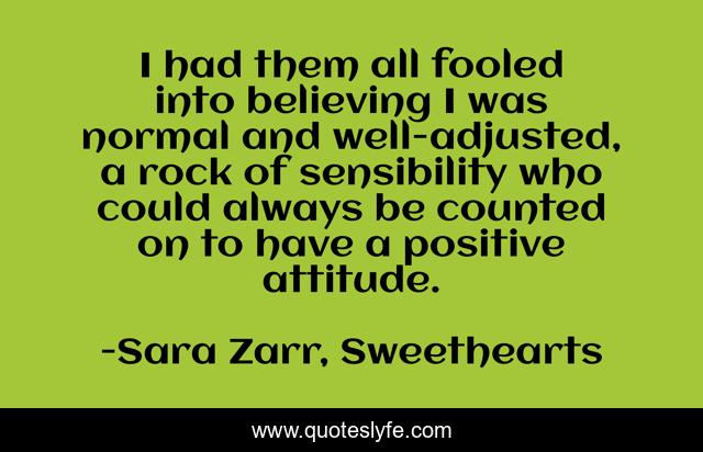 This page presents the quote "I had them all fooled into believing I was normal and well-adjusted, a rock of sensibility who could always be counted on to have a positive attitude.". Author of this quote is Sara Zarr, Sweethearts. .