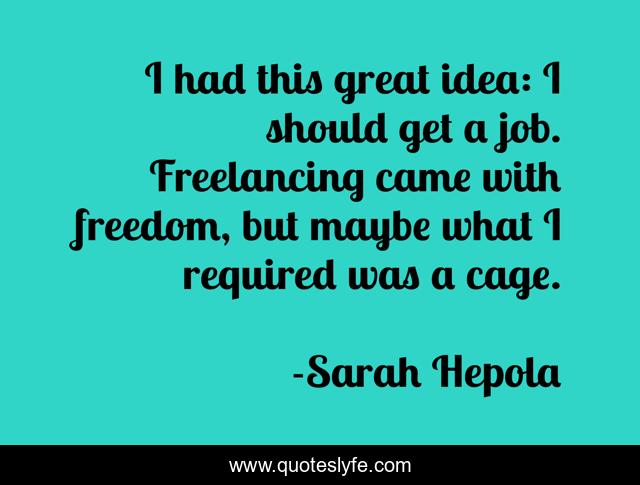 This page presents the quote "I had this great idea: I should get a job. Freelancing came with freedom, but maybe what I required was a cage.". Author of this quote is Sarah Hepola. This quote is about addiction, alcoholism,.