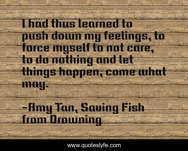 This page presents the quote "I had thus learned to push down my feelings, to force myself to not care, to do nothing and let things happen, come what may.". Author of this quote is Amy Tan, Saving Fish from Drowning. .