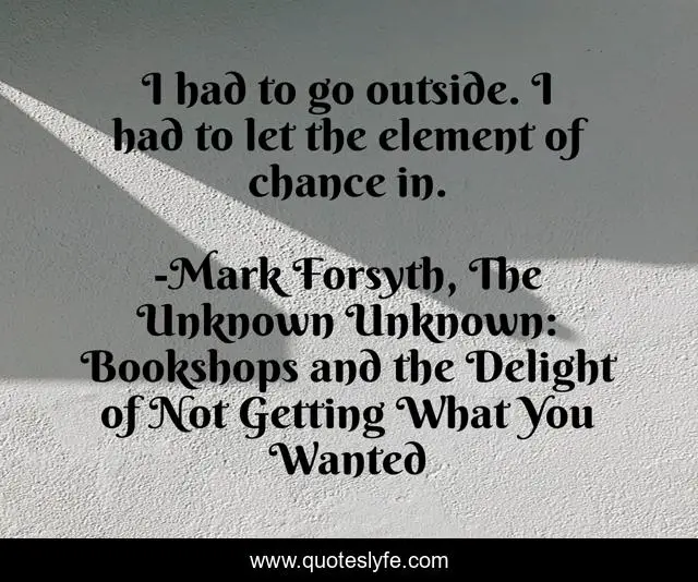 This page presents the quote "I had to go outside. I had to let the element of chance in.". Author of this quote is Mark Forsyth, The Unknown Unknown: Bookshops and the Delight of Not Getting What You Wanted. This quote is about possibilities, chance,.
