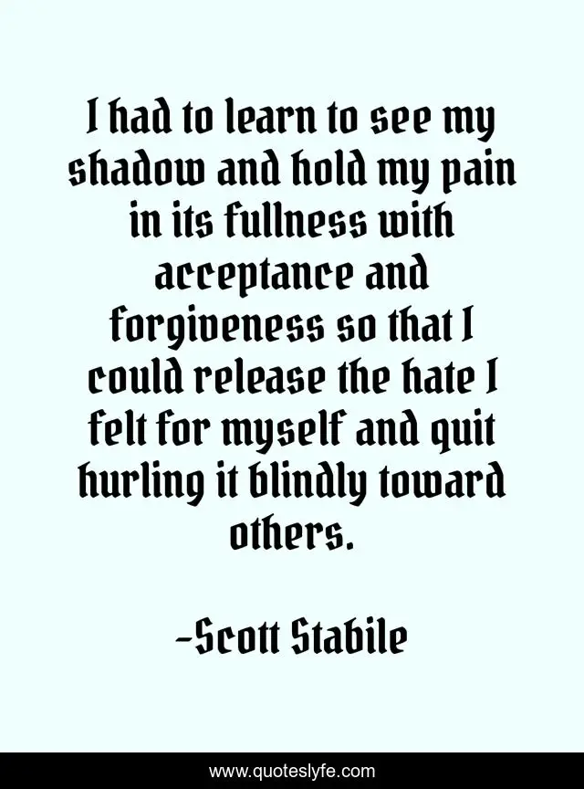 This page presents the quote "I had to learn to see my shadow and hold my pain in its fullness with acceptance and forgiveness so that I could release the hate I felt for myself and quit hurling it blindly toward others.". Author of this quote is Scott Stabile. This quote is about self-love, love, compassion, acceptance, forgive, learn, pain, hate, affection,.