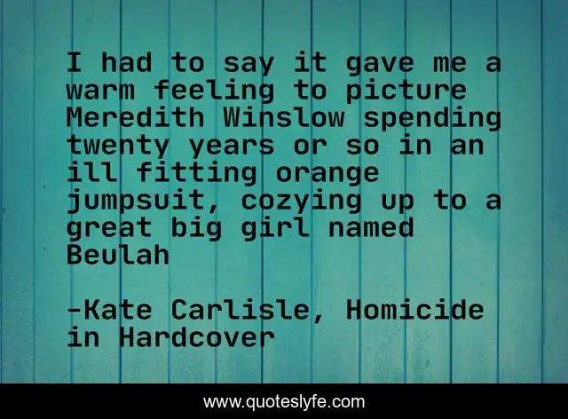 This page presents the quote "I had to say it gave me a warm feeling to picture Meredith Winslow spending twenty years or so in an ill fitting orange jumpsuit, cozying up to a great big girl named Beulah". Author of this quote is Kate Carlisle, Homicide in Hardcover. This quote is about funny, brooklyn, comedy, kate-carlisle,.