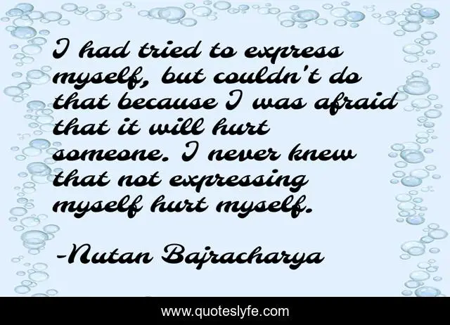 This page presents the quote "I had tried to express myself, but couldn't do that because I was afraid that it will hurt someone. I never knew that not expressing myself hurt myself.". Author of this quote is Nutan Bajracharya. This quote is about me, lovers, i, she, love-hurts, tragedy, women,.