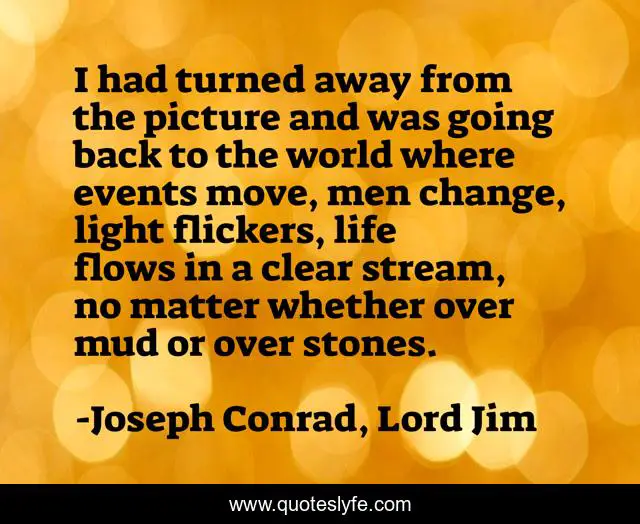 This page presents the quote "I had turned away from the picture and was going back to the world where events move, men change, light flickers, life flows in a clear stream, no matter whether over mud or over stones.". Author of this quote is Joseph Conrad, Lord Jim. This quote is about remembering, lost-friends, moving-on-and-letting-go, final-departure, life-goes-on, leaving, getting-over-it, farewell, hope,.