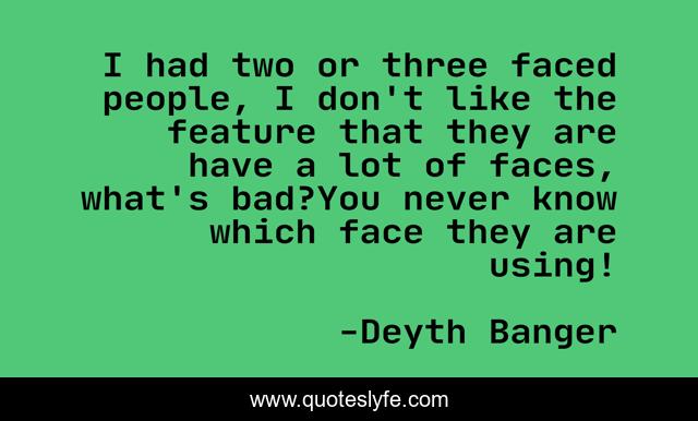 This page presents the quote "I had two or three faced people, I don't like the feature that they are have a lot of faces, what's bad?You never know which face they are using!". Author of this quote is Deyth Banger. This quote is about faced, people, had, three, two, using,.