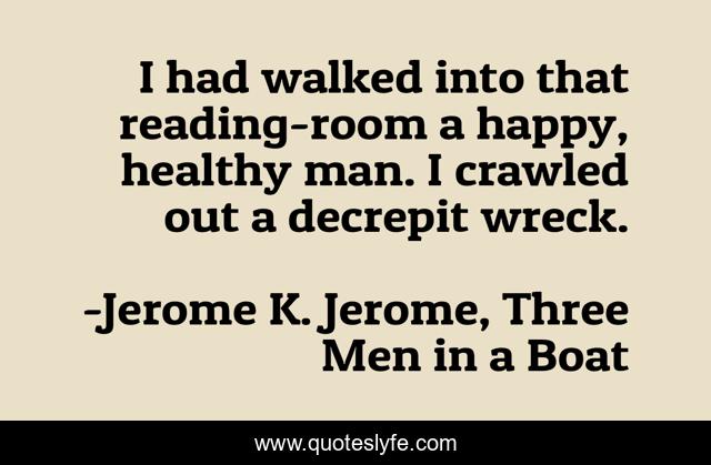 This page presents the quote "I had walked into that reading-room a happy, healthy man. I crawled out a decrepit wreck.". Author of this quote is Jerome K. Jerome, Three Men in a Boat. .
