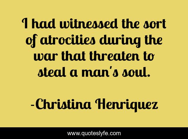 This page presents the quote "I had witnessed the sort of atrocities during the war that threaten to steal a man's soul.". Author of this quote is Christina Henriquez. This quote is about soul, war,.