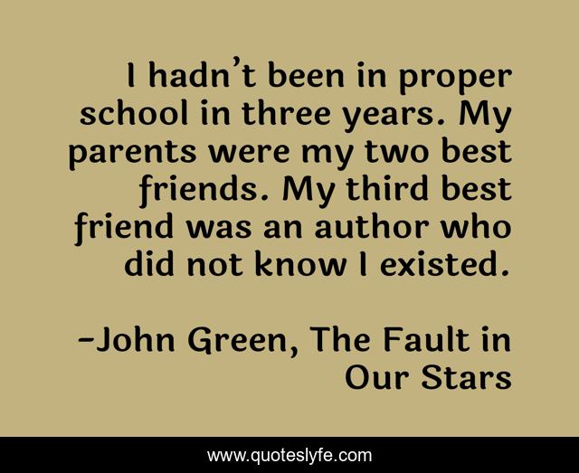 This page presents the quote "I hadn’t been in proper school in three years. My parents were my two best friends. My third best friend was an author who did not know I existed.". Author of this quote is John Green, The Fault in Our Stars. This quote is about books, friendship, family,.