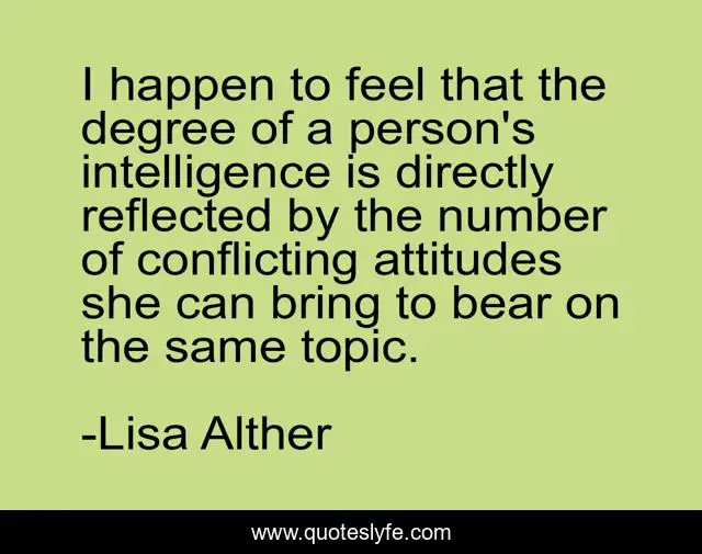 This page presents the quote "I happen to feel that the degree of a person's intelligence is directly reflected by the number of conflicting attitudes she can bring to bear on the same topic.". Author of this quote is Lisa Alther. This quote is about behaviour, intelligence, attitude,.
