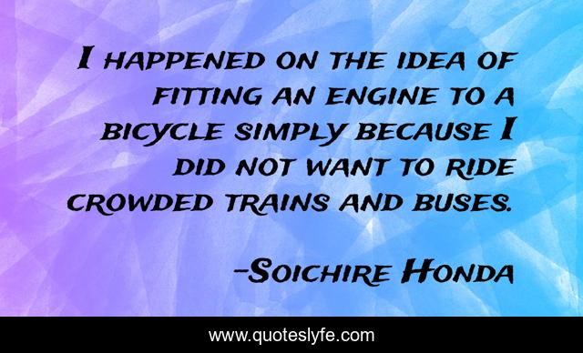 This page presents the quote "I happened on the idea of fitting an engine to a bicycle simply because I did not want to ride crowded trains and buses.". Author of this quote is Soichire Honda. .