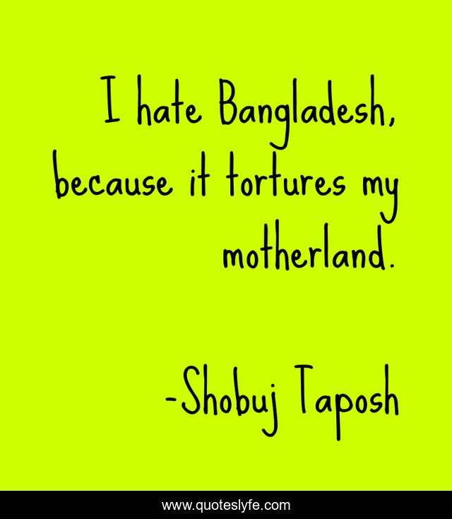 This page presents the quote "I hate Bangladesh, because it tortures my motherland.". Author of this quote is Shobuj Taposh. This quote is about motherland, tortures, hate, bangladesh,.