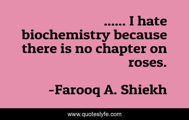 This page presents the quote "...... I hate biochemistry because there is no chapter on roses.". Author of this quote is Farooq A. Shiekh. This quote is about correlation-between-roses, biochemistry-and-life, evolution-of-love, rose-a-marker-of-love, emotions, roses, roses-and-love, biochemistry-a-chemistry-of-life, love-and-roses,.