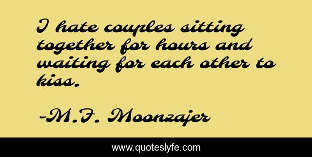 This page presents the quote "I hate couples sitting together for hours and waiting for each other to kiss.". Author of this quote is M.F. Moonzajer. This quote is about couples, waiting, kiss, together,.