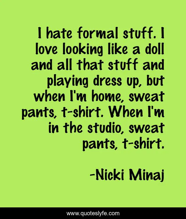 This page presents the quote "I hate formal stuff. I love looking like a doll and all that stuff and playing dress up, but when I'm home, sweat pants, t-shirt. When I'm in the studio, sweat pants, t-shirt.". Author of this quote is Nicki Minaj. This quote is about dress, hate, affection, love,.