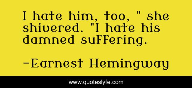 This page presents the quote "I hate him, too, " she shivered. "I hate his damned suffering.". Author of this quote is Earnest Hemingway. .