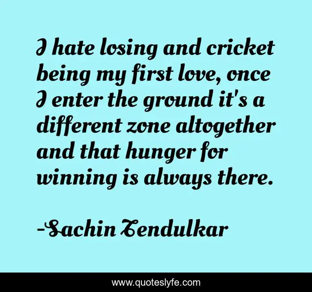 This page presents the quote "I hate losing and cricket being my first love, once I enter the ground it's a different zone altogether and that hunger for winning is always there.". Author of this quote is Sachin Tendulkar. This quote is about losing, hate, winning,.