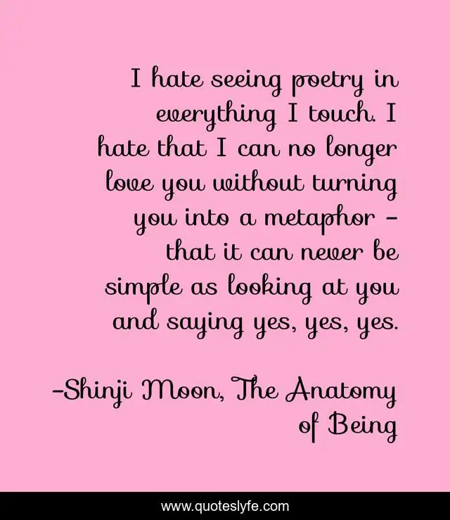 This page presents the quote "I hate seeing poetry in everything I touch. I hate that I can no longer love you without turning you into a metaphor - that it can never be simple as looking at you and saying yes, yes, yes.". Author of this quote is Shinji Moon, The Anatomy of Being. .