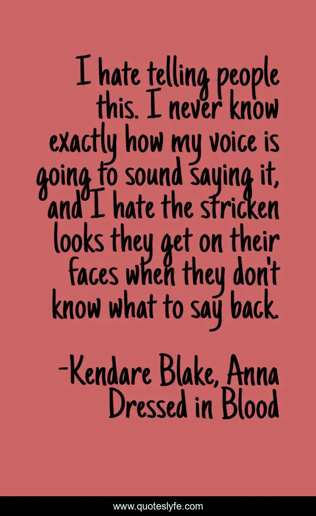 This page presents the quote "I hate telling people this. I never know exactly how my voice is going to sound saying it, and I hate the stricken looks they get on their faces when they don't know what to say back.". Author of this quote is Kendare Blake, Anna Dressed in Blood. This quote is about life, love, depressed, hurt, friend, truth, sad, friends, affection,.