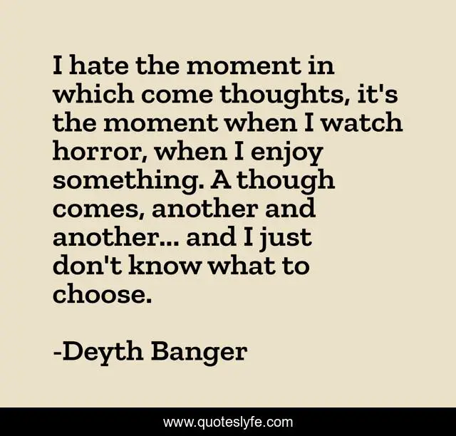 This page presents the quote "I hate the moment in which come thoughts, it's the moment when I watch horror, when I enjoy something. A though comes, another and another... and I just don't know what to choose.". Author of this quote is Deyth Banger. This quote is about enjoy, come, moment, choose, hate, thoughts,.