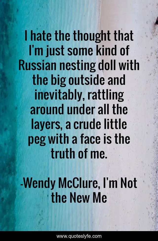 This page presents the quote "I hate the thought that I'm just some kind of Russian nesting doll with the big outside and inevitably, rattling around under all the layers, a crude little peg with a face is the truth of me.". Author of this quote is Wendy McClure, I'm Not the New Me. This quote is about insecurity, self-loathing, self-worth,.