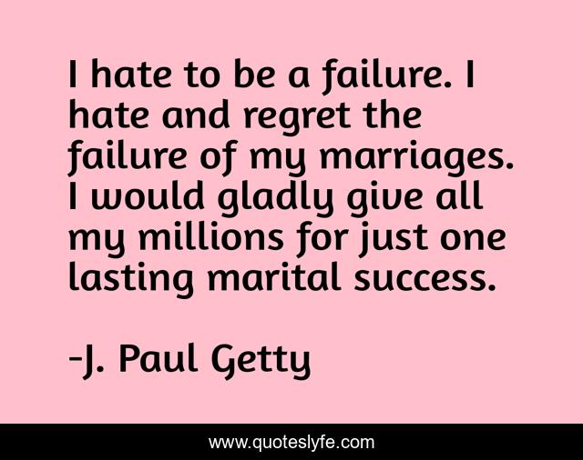 This page presents the quote "I hate to be a failure. I hate and regret the failure of my marriages. I would gladly give all my millions for just one lasting marital success.". Author of this quote is J. Paul Getty. This quote is about hate, regret, success,.