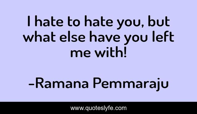 This page presents the quote "I hate to hate you, but what else have you left me with!". Author of this quote is Ramana Pemmaraju. This quote is about love, breakup, past-and-present, hate, relationshipionship, affection,.
