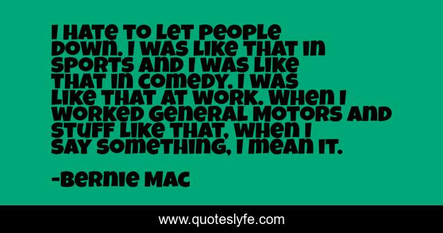 This page presents the quote "I hate to let people down. I was like that in sports and I was like that in comedy. I was like that at work. When I worked General Motors and stuff like that, when I say something, I mean it.". Author of this quote is Bernie Mac. This quote is about work, hate, people,.