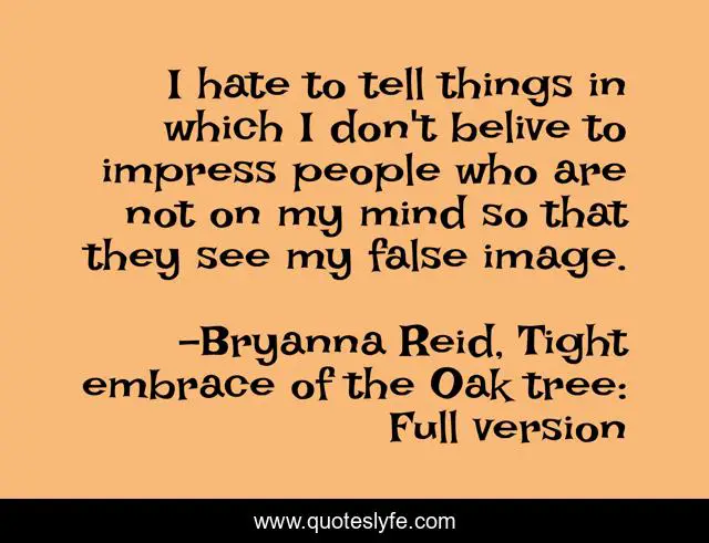 This page presents the quote "I hate to tell things in which I don't belive to impress people who are not on my mind so that they see my false image.". Author of this quote is Bryanna Reid, Tight embrace of the Oak tree: Full version. This quote is about society, false, truth, hypocrisy,.