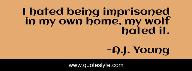 This page presents the quote "I hated being imprisoned in my own home, my wolf hated it.". Author of this quote is A.J. Young. This quote is about wolf-shifters, mating-bond, mating-ritual, bride, mate, supernatural, wolf, eighteen-year-old, wolf-pack,.