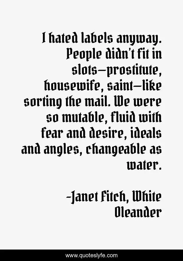 This page presents the quote "I hated labels anyway. People didn’t fit in slots—prostitute, housewife, saint—like sorting the mail. We were so mutable, fluid with fear and desire, ideals and angles, changeable as water.". Author of this quote is Janet Fitch, White Oleander. .