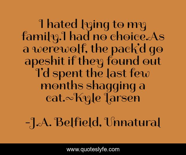 This page presents the quote "I hated lying to my family.I had no choice.As a werewolf, the pack’d go apeshit if they found out I’d spent the last few months shagging a cat.~Kyle Larsen". Author of this quote is J.A. Belfield, Unnatural. This quote is about holloway-pack, j-a-belfield, paranormal-romance, unnnatural, werewolf,.