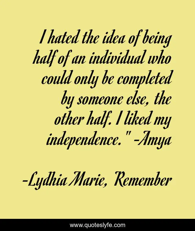 This page presents the quote "I hated the idea of being half of an individual who could only be completed by someone else, the other half. I liked my independence." -Amya". Author of this quote is Lydhia Marie, Remember. This quote is about freedom, teenager, independence,.