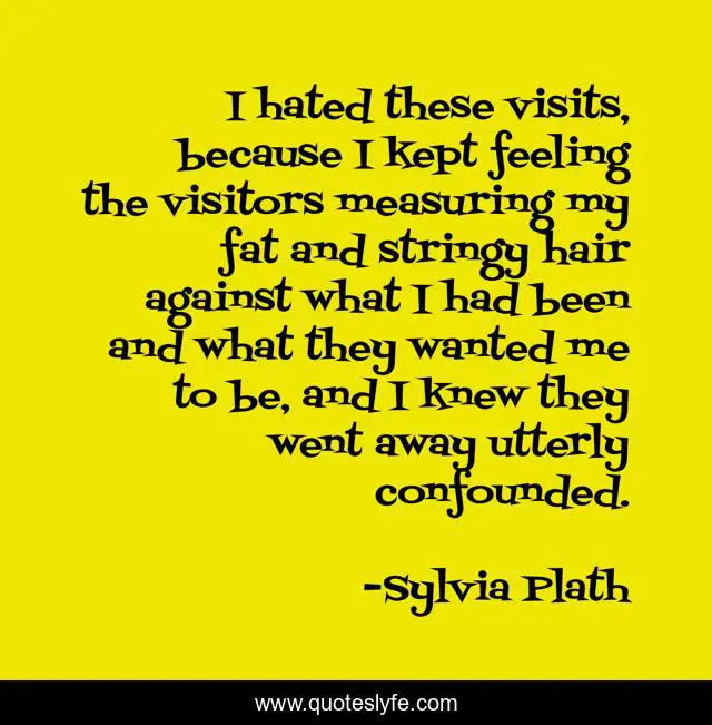 This page presents the quote "I hated these visits, because I kept feeling the visitors measuring my fat and stringy hair against what I had been and what they wanted me to be, and I knew they went away utterly confounded.". Author of this quote is Sylvia Plath. This quote is about comparison, mental-health-stigma, distortion, society, mental-health, depression, stigma, transformation, change,.