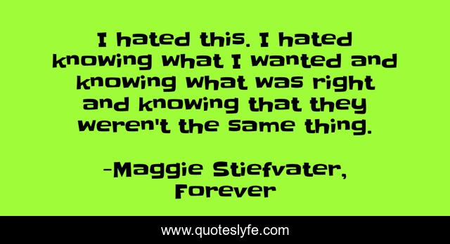 This page presents the quote "I hated this. I hated knowing what I wanted and knowing what was right and knowing that they weren't the same thing.". Author of this quote is Maggie Stiefvater, Forever. This quote is about life, right, love, money, advice, school, wisdom, romance, quotes,.