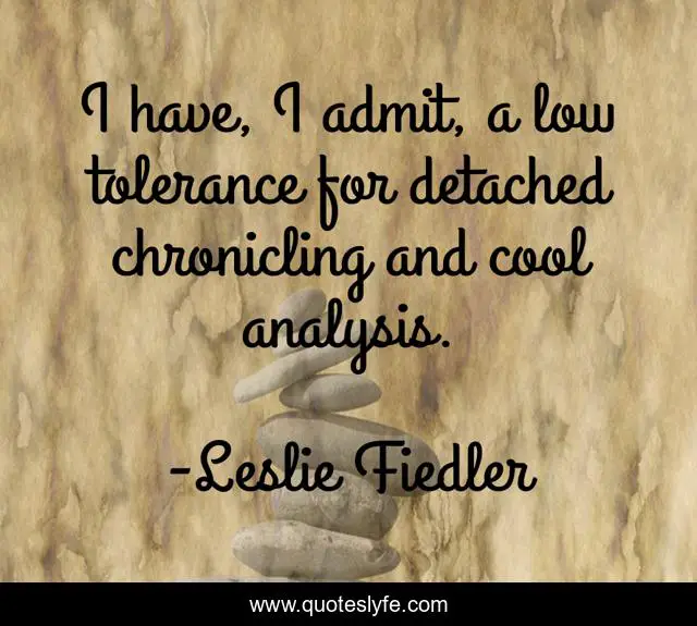 This page presents the quote "I have, I admit, a low tolerance for detached chronicling and cool analysis.". Author of this quote is Leslie Fiedler. This quote is about admit, tolerance, analysis,.