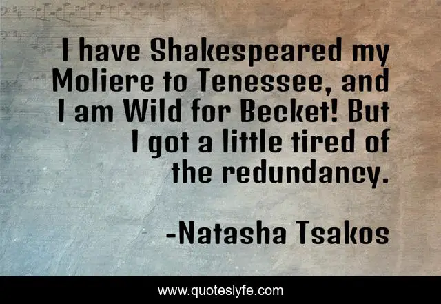 This page presents the quote "I have Shakespeared my Moliere to Tenessee, and I am Wild for Becket! But I got a little tired of the redundancy.". Author of this quote is Natasha Tsakos. This quote is about tenessee, theatre, shakespeare, moliere, authors, beckett,.