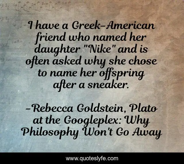 This page presents the quote "I have a Greek-American friend who named her daughter "Nike" and is often asked why she chose to name her offspring after a sneaker.". Author of this quote is Rebecca Goldstein, Plato at the Googleplex: Why Philosophy Won't Go Away. This quote is about classics, perspective, vocabulary,.