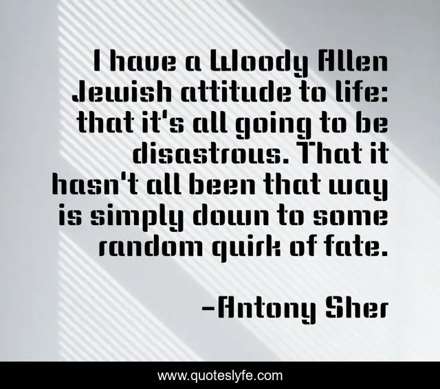 This page presents the quote "I have a Woody Allen Jewish attitude to life: that it's all going to be disastrous. That it hasn't all been that way is simply down to some random quirk of fate.". Author of this quote is Antony Sher. This quote is about down, life, fate,.