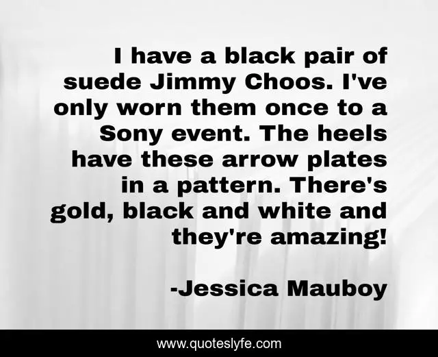 This page presents the quote "I have a black pair of suede Jimmy Choos. I've only worn them once to a Sony event. The heels have these arrow plates in a pattern. There's gold, black and white and they're amazing!". Author of this quote is Jessica Mauboy. This quote is about black, black and white, gold,.